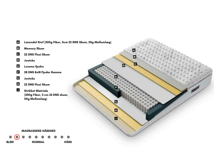 Tisvilde Premium madrassen er den som følger med komplette senge og har indbygget topmadras, medmindre anden madras vælges - læs om de andre madrasser her.