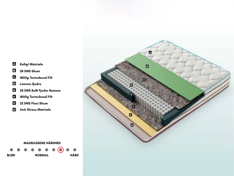 Tisvilde Premium er vores faste og pålidelige madras, som følger med i prisen, når du vælger en komplet seng. Den er udviklet til at give en balanceret komfort med en kombination af støtte og affjedring, der passer til langt de fleste. Det er en oplagt løsning, hvis du ønsker en god allround-madras uden at skulle tage stilling til for mange valg. Tisvilde Premium er ideel for dig, der vil i gang med at sove godt – fra dag ét.