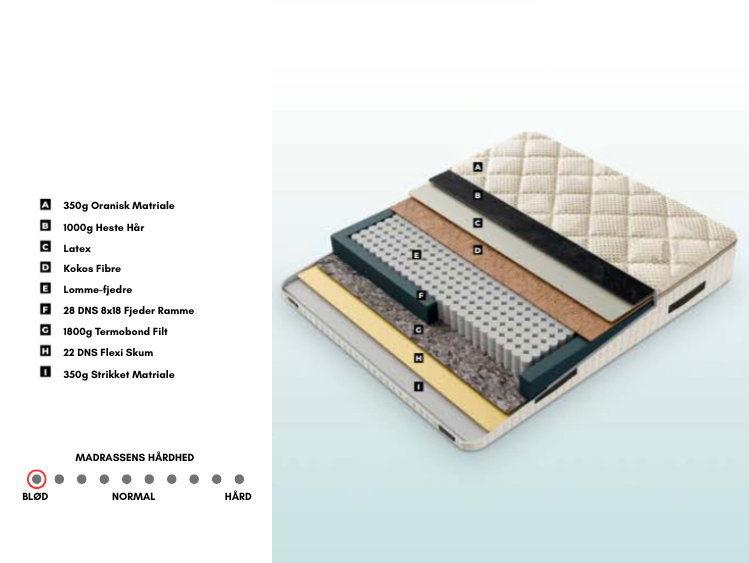 Natural Dream er det oplagte valg for dig, der foretrækker en ekstra blød og naturligt åndbar madras. En blød seng som er fremstillet af latex og kokosfibre – to materialer, der giver både fleksibilitet og naturlig ventilation. Latex’en sikrer en blød og elastisk overflade, mens kokosfibrene skaber en støttende kerne med god holdbarhed. Resultatet er en madras, der omfavner kroppen og giver en nænsom støtte hele natten – perfekt til dig, der sover på siden eller elsker følelsen af at "synke ned" i madrassen.